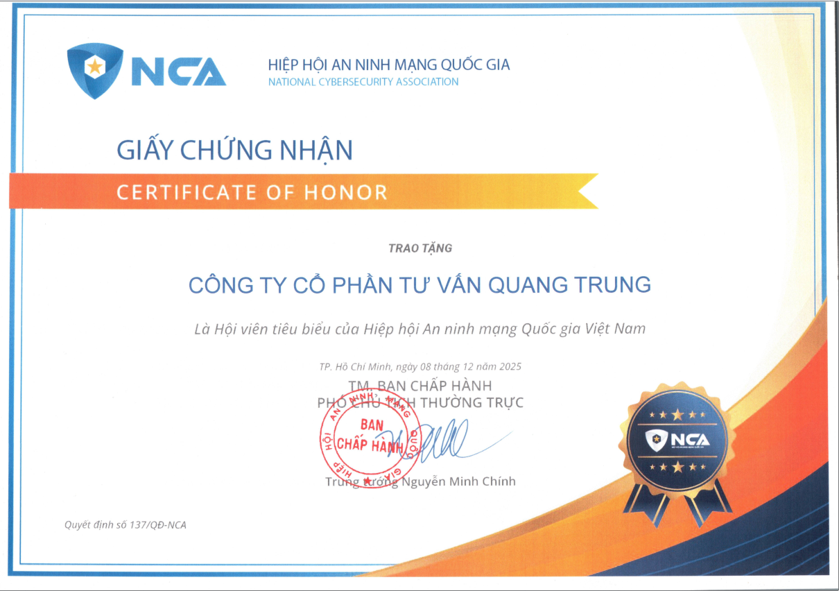 Công ty Cổ phần Tư vấn Quang Trung (Quang Trung Consulting joint stock Company – QTCC) vinh dự được công nhận là hội viên tiêu biểu của Hiệp hội An ninh mạng Quốc gia Việt Nam (National Cybersecurity Association – NCA). Đây là dấu mốc quan trọng, khẳng định uy tín, năng lực chuyên môn và vai trò trách nhiệm của Quang Trung Consulting joint stock Company trong hệ sinh thái an ninh mạng và chuyển đổi số tại Việt Nam.