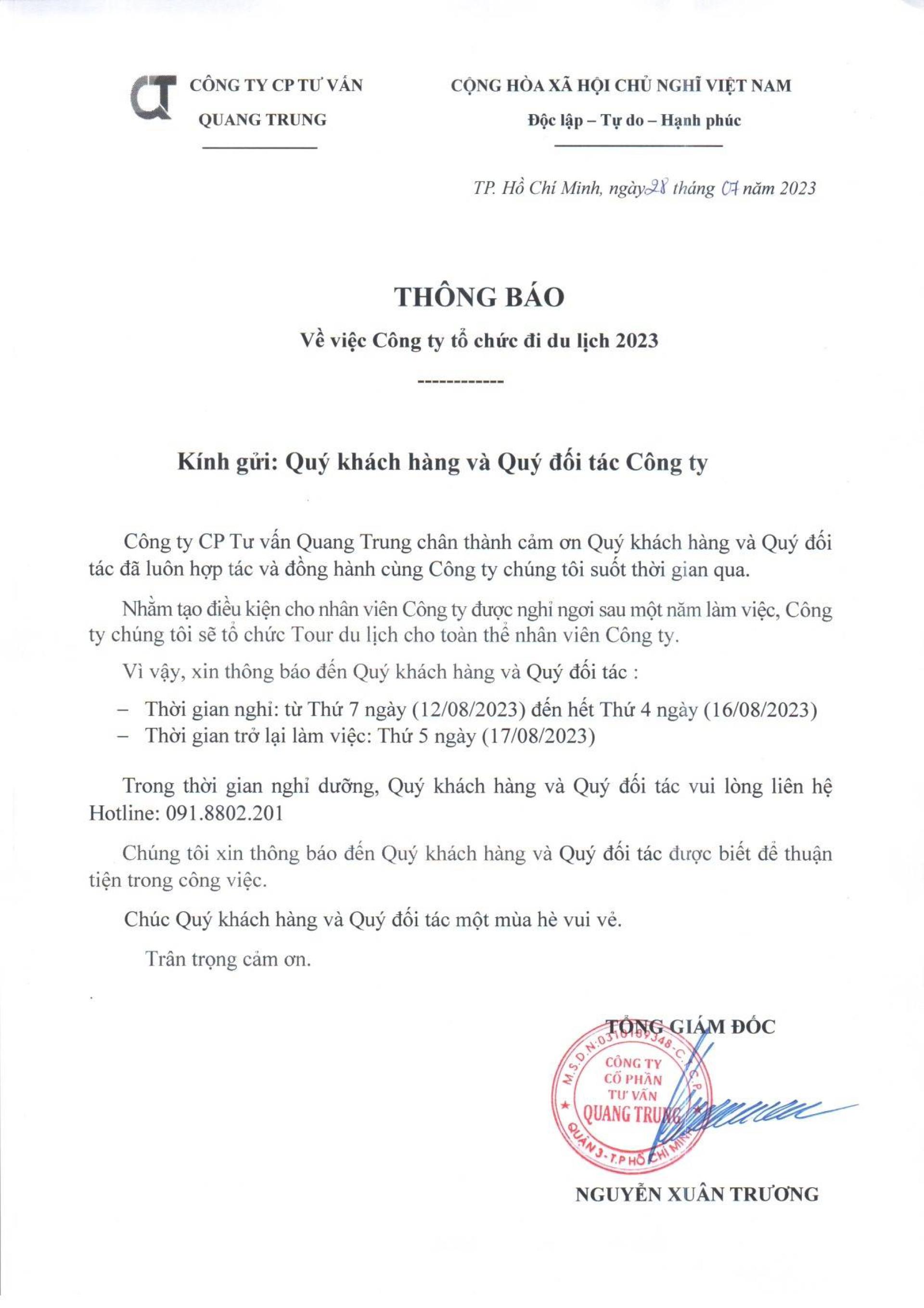Thông báo về việc Công ty tổ chức đi du lịch năm 2023