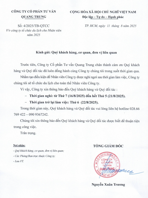 Công ty Cổ phần Tư vấn Quang Trung chân thành cảm ơn Quý khách hàng và Quý đối tác đã luôn hợp tác và đồng hành cùng Công ty chúng tôi suốt thời gian qua.